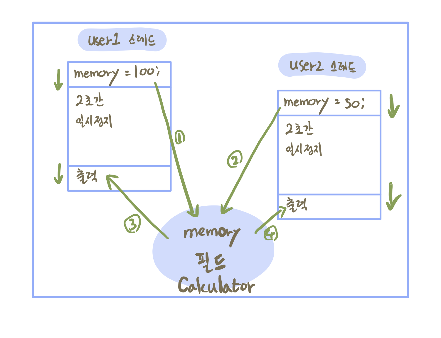 User1 스레드가 Calculator 객체의 memory 필드에 100을 먼저 저장하고 2초간 일시정지 상태가 됩니다.