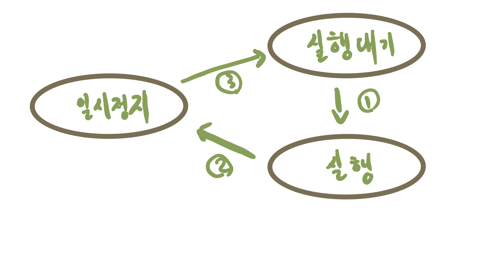 또한, 경우에 따라서 일시 정지 상태를 가지기도 합니다. 일시정지 상태에서 바로 실행할 수는 없고 실행 대기상태로 빠져나온 후 다시 실행을 합니다. 그림으로 한번 살펴보겠습니다.