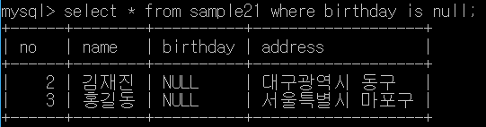 SELECT * FROM sample21 where birthday = null;