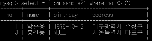 위 그림은 sample21 테이블에서 where 구를 이용해 2번 값만 선택한 화면이다.